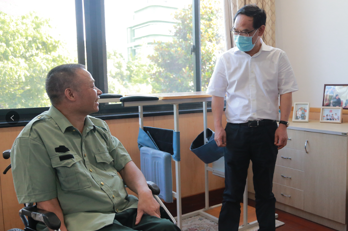 在榮軍病區(qū),林云舉親切看望慰問在院休養(yǎng)榮軍代表徐國平、胡映芳,與榮軍面對(duì)面交談,當(dāng)看到他們個(gè)個(gè)神采奕奕的時(shí)候,林云舉十分高興,囑咐他們要保重身體,安心休養(yǎng),并提前致以“八·一”節(jié)日祝福和慰問。